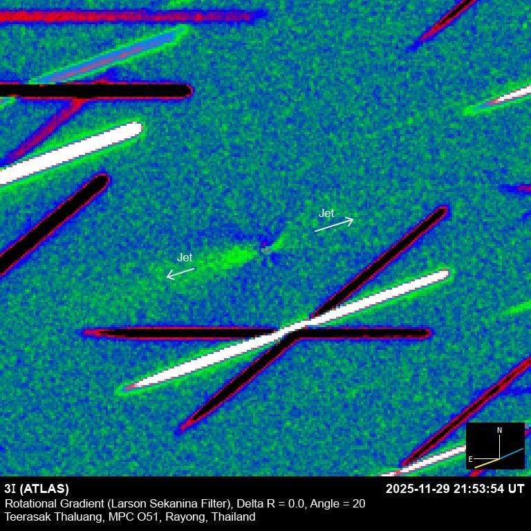 2025年11月29日にタイで撮影された観測画像には、明瞭な2本のジェット、さらに太陽方向に伸びる「逆さの尾(アンチテイル)」も確認されています。