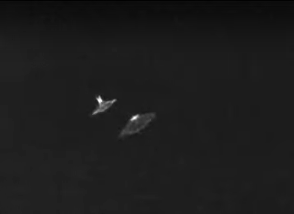 映像の冒頭では、夜空を横切る2つの円盤状の発光体が、まるで連動するかのように並走していく様子が確認できます。