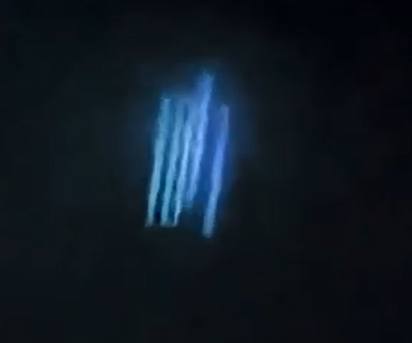 複数の動画の中でも、特に注目を集めているのが、縦方向に並んだ約5本の光のラインと、それを囲むように広がるリング状の光を捉えた映像です。動画を見る限り、光源は点滅や爆発光ではなく、一定の輝度で発光しているように見え、従来の航空機やヘリコプターのライト配置とは一致しません。