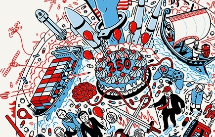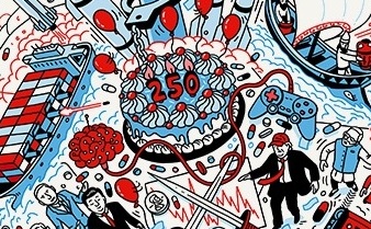 大きく描かれた「250」という数字とケーキは、アメリカ建国250周年を指すと考えられる。2026年、アメリカは建国から250年という大きな節目を迎え、国内では政府主導のイベントや記念硬貨の発行などが予定されている。