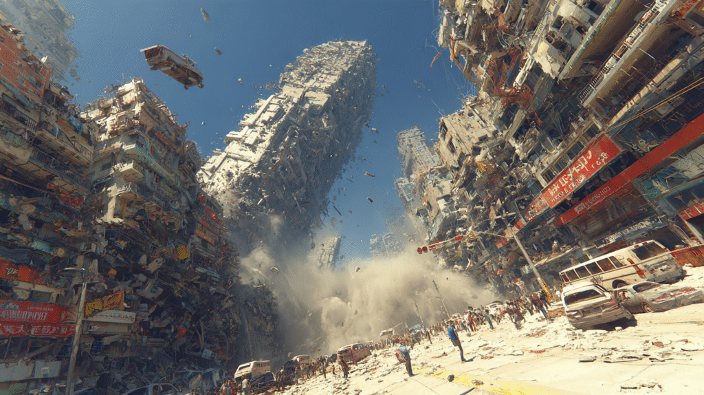 株式市場の大きな下落、アメリカ経済の失速、基軸通貨としてのドルの信頼低下——といったシナリオを連想させるモチーフだ。第三次世界大戦級の緊張が高まり、経済制裁やエネルギー危機、サイバー攻撃などが重なれば、金融市場は大きく揺れる可能性がある。
